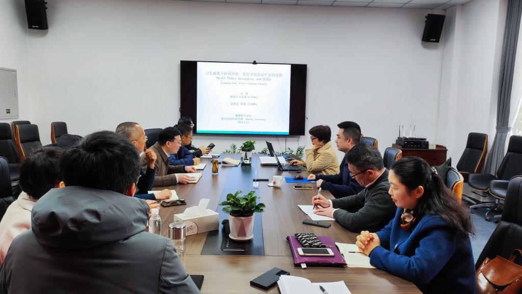 2月23日上午,麻将胡了 在尚德楼268会议室成功举办第18期南湖青年论坛。香港中文大学经济系助理教授、浙江大学—香港中文大学数字经济联合研究中心副主任史册应邀作题为《卫生政策与医药创新:来自中国疫苗产业的证据》的学术报告,麻将胡了 院长文雁兵教授主持,学院多名教师共同参与研讨。